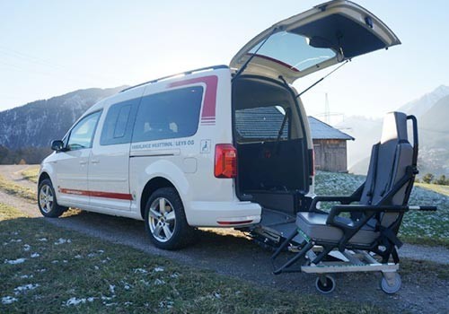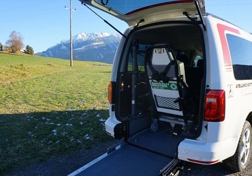 Zusätzlich bieten wir mit einem Spezialkrankentransportfahrzeug (VW-Caddy) Rollstuhltransporte an. Bei diesem Fahrzeug ist unter anderem auch ein Transport mit dem Rollstuhl des Patienten möglich.