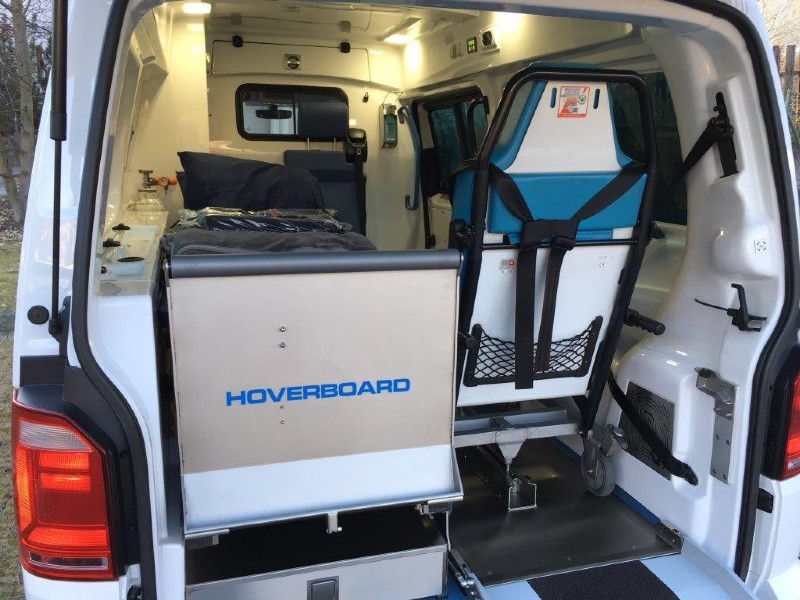 Ob Manueller-Rollstuhl oder Elektrischer-Rollstuhl, der Patient kann über eine Rampe direkt ins Fahrzeug einfahren, wird dort vorschriftsgemäß gesichert und kann während der Fahrt auf seinem Rollstuhl sitzen bleiben. (schmerzhaftes bzw. anstrengendes „Umsteigen“ von Rollstuhl auf Tragstuhl bzw. auf die Liege eines Krankentransportfahrzeuges entfällt)